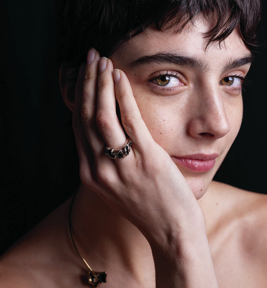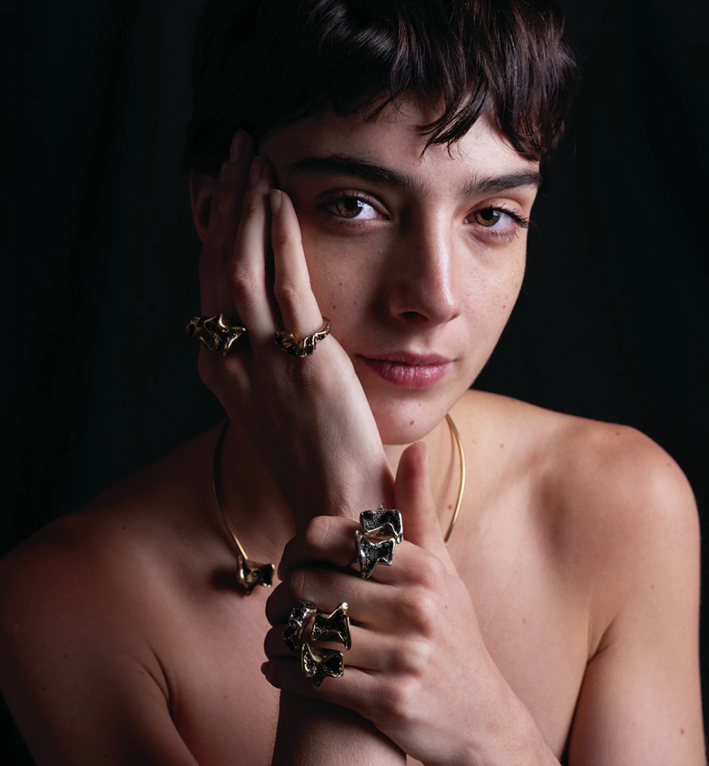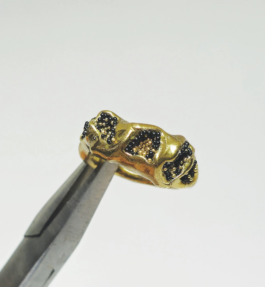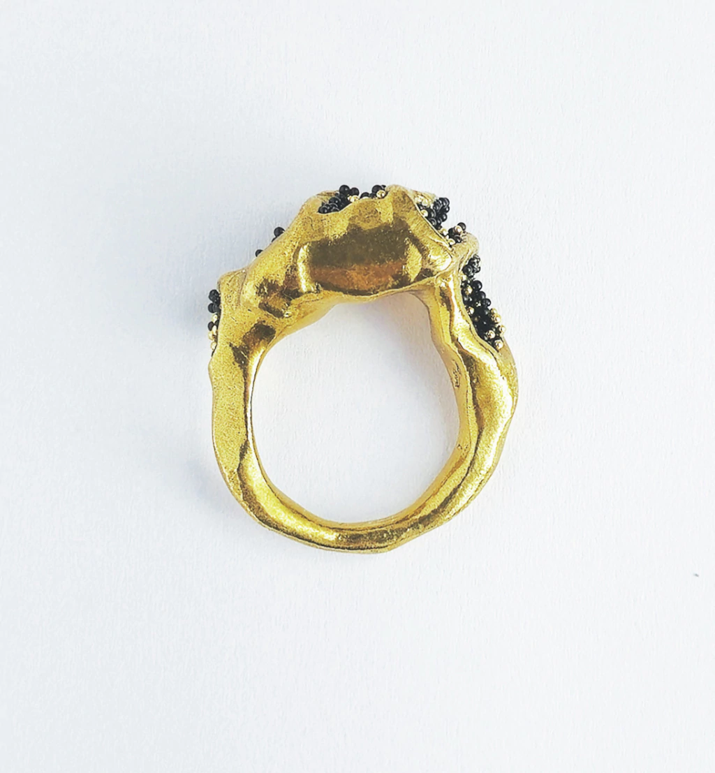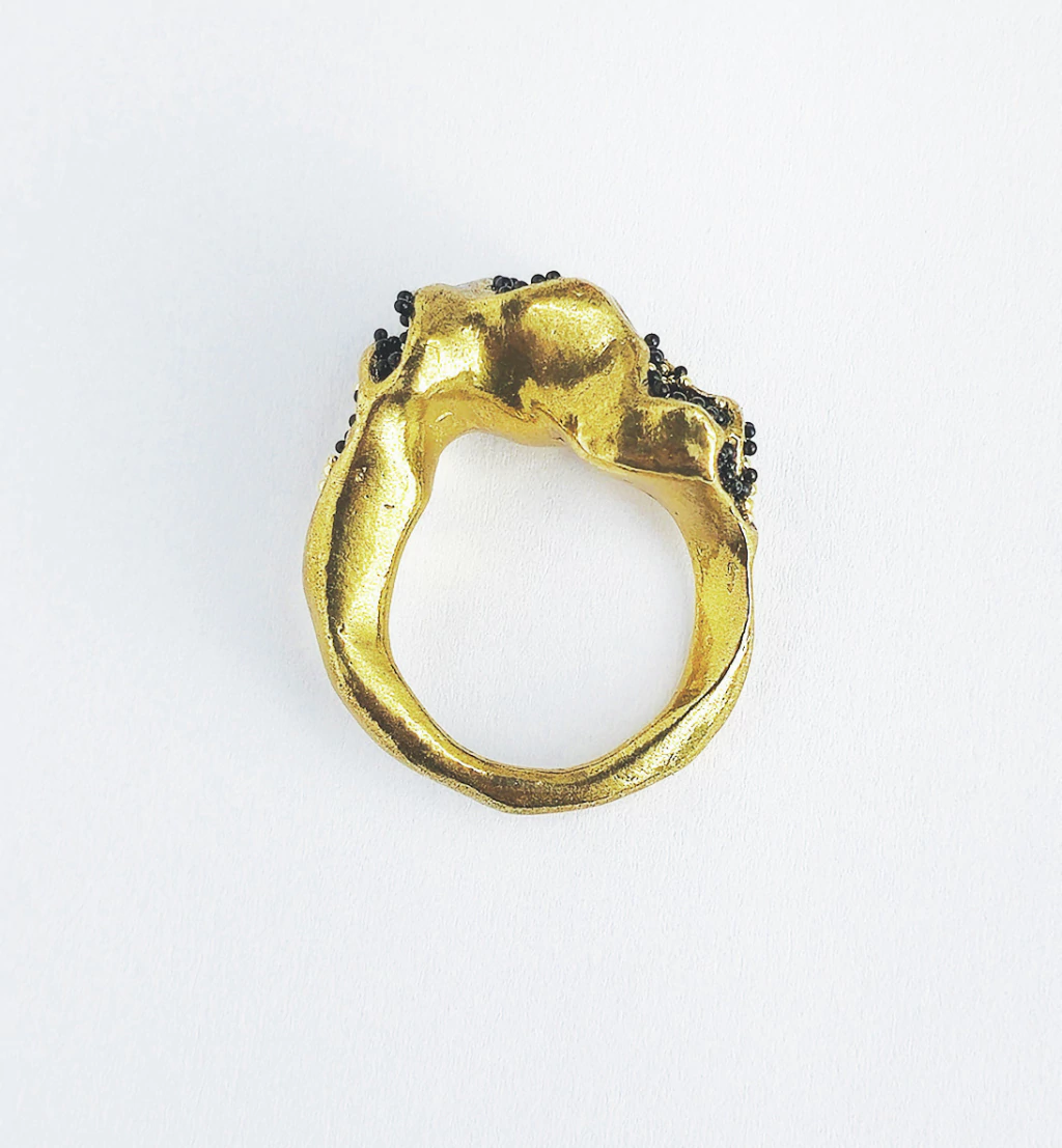 Desde la colección "Metales de Papel" surge este anillo artesanal de superficie irregular y texturizada, tiene distintas cavidades que capturan el brillo de las estrellas en su interior.